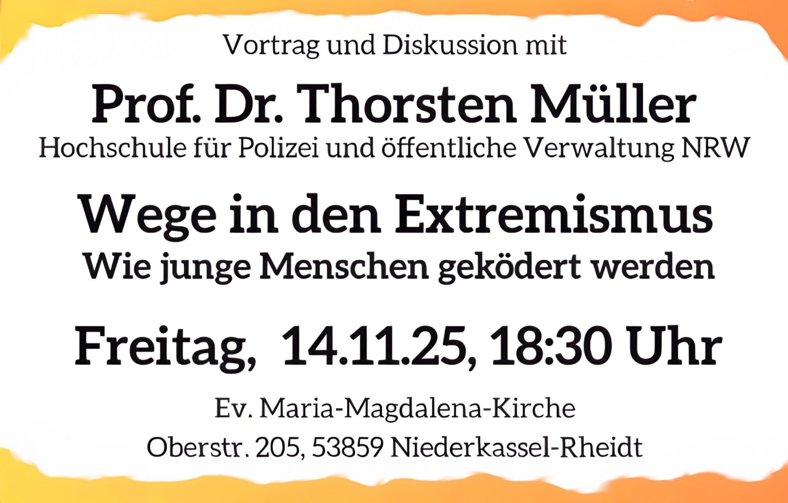 Prof. Dr. Thorsten Müller von der Hochschule für Polizei und öffentliche Verwaltung Nordrhein-Westfalen hält am Freitag, dem 14. November 2025, einen Vortrag zum Thema „Wege in den Extremismus – Wie junge Menschen geködert werden“.