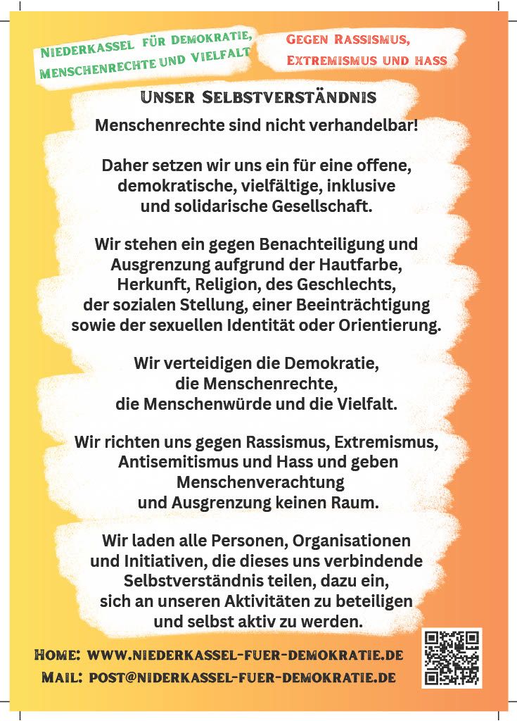 Das Thema: Niederkassel für Demokratie – Wir setzen ein Zeichen für eine Gesellschaft ohne Rassismus, ohne Extremismus, ohne Hass und ohne Parteien oder Positionen, die die Würde des Menschen missachten oder die demokratische Grundordnung in Frage stellen.